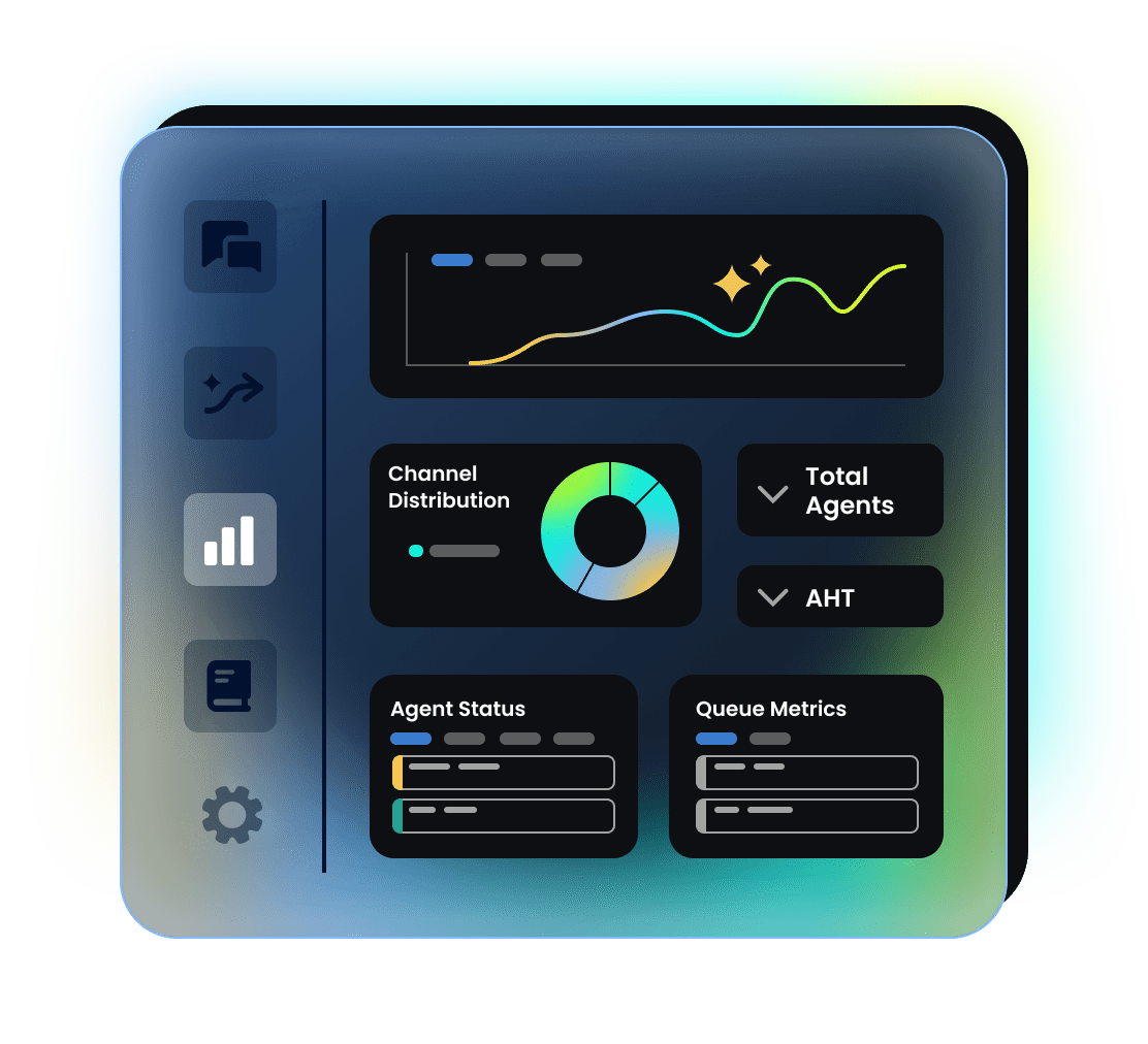 Live dashboards with queue metrics, SLA tracking, agent performance, and AI containment, plus conversation intelligence to surface trends and coaching opportunities.